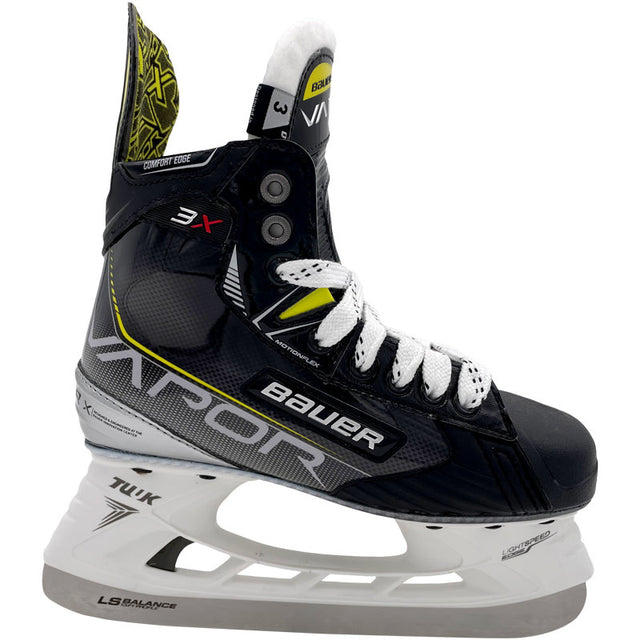 The Bauer Vapor 3X Ice Hockey skate for juniors has a junior specific design, a digi comp quarter with a slightly softer construction and MOTION FLEX Technology increases the forward flex of the boot. For a younger player developing their stride, this ease of flex helps build good technique. Bauer Vapor 3X Ice Hockey Skate is also more comfortable and has a better fit with an asymmetrical toe cap which creates a better connection for the player's foot to the boot by minimizing negative space around the toes. The Vapor 3X junior ice hockey skate also offers a better balanced blade, the LS Balance Blade with 13ft radius gives young players an easier to learn skating stride and confidence stepping on the ice.