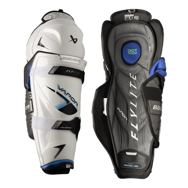 Fly at full strength. Bauer's Vapor FLYLITE SHIN GUARD is ultralight protection and best-in-class fit making these shin guards feel like they’re part of your body. Featuring a stiffer external shin and anatomical knee cap, plus an adaptive sling system that adds an extra buffer for impacts, these shin guards combine the best parts of protection, comfort, and agility. And with a full-coverage calf guard and a deeper-fitting knee, blocked shots, spills, or accidental slashes will be quickly forgotten.
