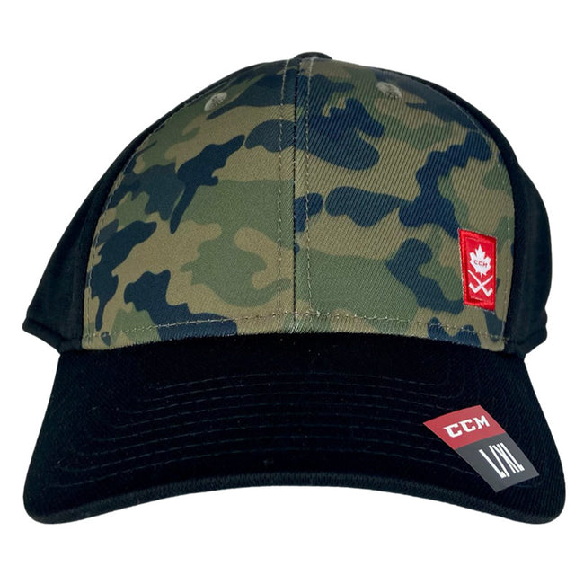 CCM's Camo Leaf Structured Flex Cap with sublimated camo pattern brings the outdoors to the rink with the classy CCM Leaf woven on the front.