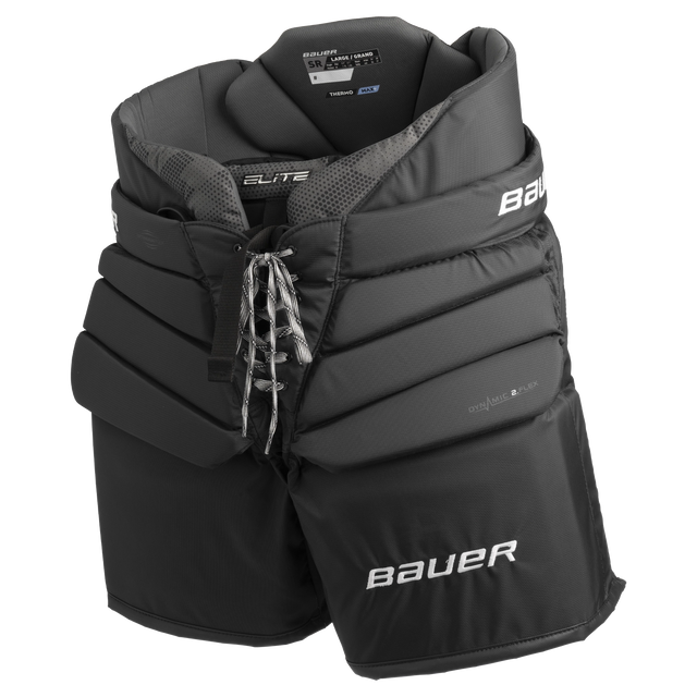 Bauer's Elite Pant is designed for competitive goalies. The new, lightweight and adjustable/removable belt allows goalies to move around the crease comfortably, while offering more protection than the GSX.