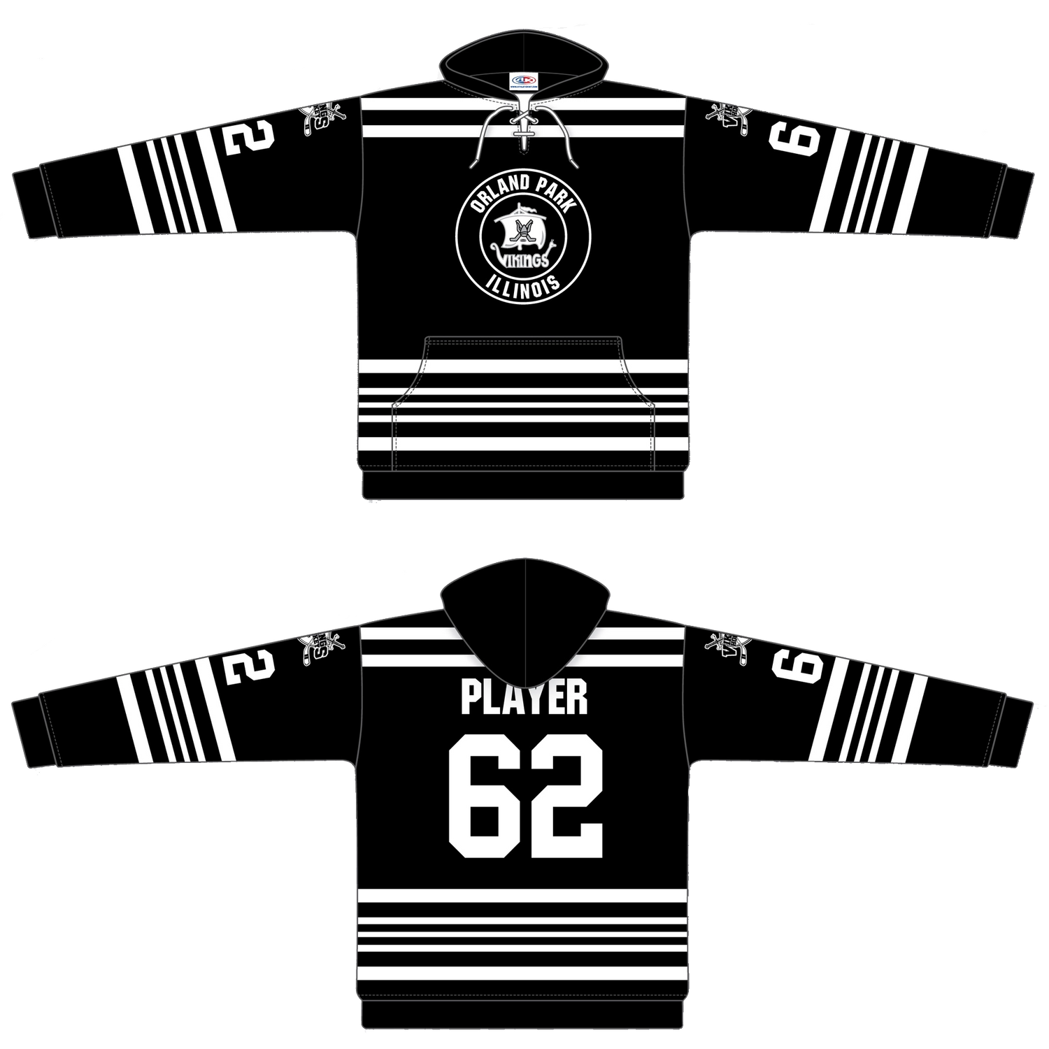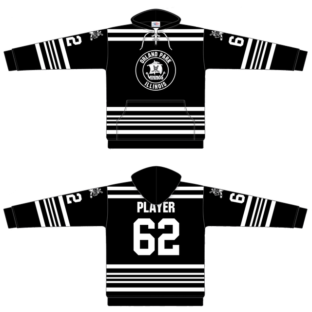 The Vikings - AK Sublimated Hoodie combines vibrant sublimated graphics with durable polyfleece fabric for exceptional comfort and warmth on and off the ice. Designed with integrated skate lace features, this hoodie offers a secure, customizable fit for hockey players. Its advanced materials ensure breathability and durability, making it an essential piece for both training sessions and casual wear.