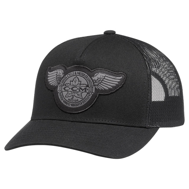 Keep your head cool in the CCM Monochrome meshback trucker cap. Featuring an adjustable meshback and a woven CCM wing patch on the front with an 1899 embroidery on the side and CCM embroidery at the center back. This cap ensures comfort and breathability no matter the situation.